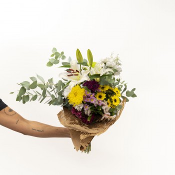 Ramo de flores variadas, follaje y elementos botanicos especialmente seleccionados.