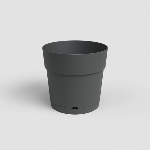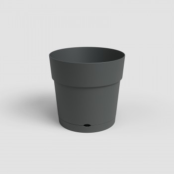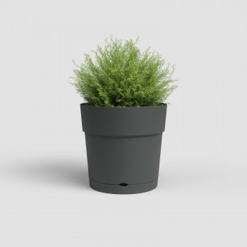 Maceta de plástico reciclado, fabricada en polipropileno, ligera, duradera, reciclable y reutilizable, con protección UV, resistente a las heladas y con orificios de drenaje. Incluye plato integrado con sistema de clic para la retención de agua. Apta para exteriores e interiores, con capacidad de 33 L. Fabricada en Portugal.