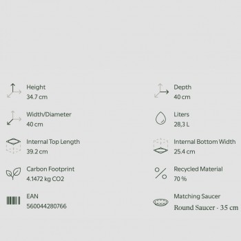 Maceta de plástico reciclado de polipropileno, ligera, duradera, reciclable y reutilizable, con protección UV, resistente a las heladas y con orificios de drenaje. Apta para exteriores e interiores, con capacidad de 28,3 l. Se puede complementar con un plato redondo para uso en interiores. Fabricada en Portugal.