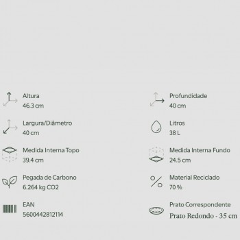 Maceta alta de plástico reciclado, fabricado en polipropileno, ligero, duradero, reciclable y reutilizable, con protección UV y resistente a las heladas. Incluye orificios de drenaje y un tapón en la base. Apto para exteriores e interiores, con una capacidad de 38 l. Se puede complementar con un plato redondo para uso en interiores. Fabricado en Portugal.